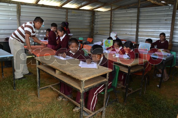 Zontecomapa, Municipio de Acatepec, Guerrero. 19 Agosto 2014. Estudiantes indígenas me phaas de la comunidad de Zontecomapa, municipio de Acatepec, iniciaron el ciclo escolar tomando clases en aulas improvisadas con palos y láminas construidas por sus padres. Sus escuelas fueron sepultadas por las tormentas tropicales Ingrid y Manuel y, a casi un año del desastre natural, continúan sin recibir ayuda.
