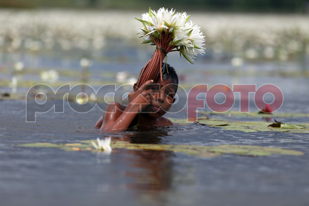 Tres niños de entre ocho y once años cortan nenúfares en la laguna de Axochiapan. Los pequeños nadan hasta el centro del embalse donde se encuentran las plantas de flor blanca que son arrancadas desde su tallo en el suelo lodoso. Los lirios de agua son vendidos a los visitantes de la laguna por 5 o 15 pesos. Un buen día de trabajo deja cerca de 300 pesos. El riesgo de la actividad es grande ya que ningún adulto acompaña a los menores.