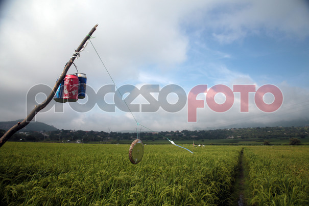 Peones cosechan arroz en el campo Tlazala en Xochitepec Morelos. El arroz que se produce en Morelos es considerado uno de los mejores a nivel mundial. Los productores sortean dificultades que van desde las aves que comen su producto hasta colocarlo en el mercado a buen precio. Aparte de los peones que cosechan el arroz existe el “pajarero” que asusta a las aves con sonidos producidos por latas colgadas de postes, además de los tradicionales “espantapájaros”.