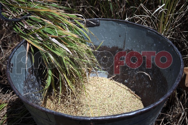 Peones cosechan arroz en el campo Tlazala en Xochitepec Morelos. El arroz que se produce en Morelos es considerado uno de los mejores a nivel mundial. Los productores sortean dificultades que van desde las aves que comen su producto hasta colocarlo en el mercado a buen precio. Aparte de los peones que cosechan el arroz existe el “pajarero” que asusta a las aves con sonidos producidos por latas colgadas de postes, además de los tradicionales “espantapájaros”.
