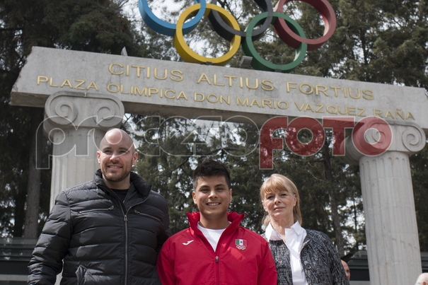 El atleta Rodolfo Dickson de esquí alpino y sus padres, durante el abanderamiento de la delegación que participará en los Juegos Olímpicos de invierno Pyeongchang 2018.