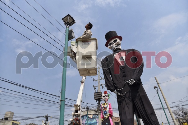 En la entrada de poblado de San Andrés Mixquic, en la Alcaldía Tlahuac, las autoridades colocaron las tradicionales catrinas como parte de la celebración del Día de Muertos, a pesar de que los panteones de la Ciudad de México permanecerán cerrados para evitar aglomeraciones y así tratar de bajar los índices de contagio del Covid-19 entre la población.