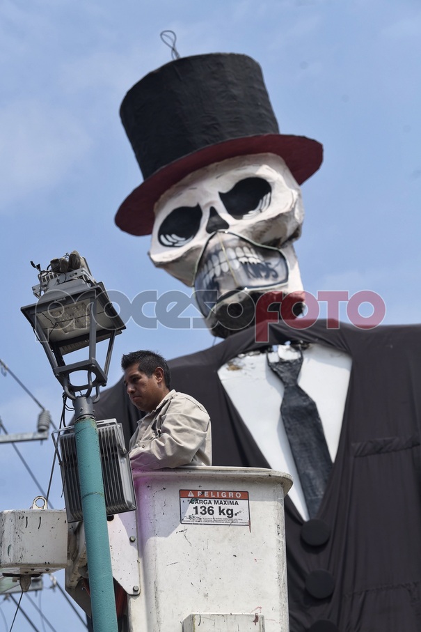 En la entrada de poblado de San Andrés Mixquic, en la Alcaldía Tlahuac, las autoridades colocaron las tradicionales catrinas como parte de la celebración del Día de Muertos, a pesar de que los panteones de la Ciudad de México permanecerán cerrados para evitar aglomeraciones y así tratar de bajar los índices de contagio del Covid-19 entre la población.