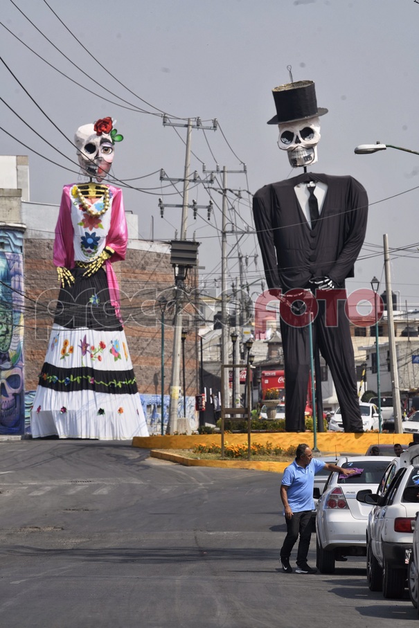 En la entrada de poblado de San Andrés Mixquic, en la Alcaldía Tlahuac, las autoridades colocaron las tradicionales catrinas como parte de la celebración del Día de Muertos, a pesar de que los panteones de la Ciudad de México permanecerán cerrados para evitar aglomeraciones y así tratar de bajar los índices de contagio del Covid-19 entre la población.