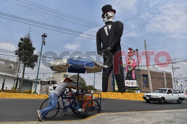 En la entrada de poblado de San Andrés Mixquic, en la Alcaldía Tlahuac, las autoridades colocaron las tradicionales catrinas como parte de la celebración del Día de Muertos, a pesar de que los panteones de la Ciudad de México permanecerán cerrados para evitar aglomeraciones y así tratar de bajar los índices de contagio del Covid-19 entre la población.