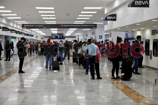 Imágenes de la terminal 1 del Aeropuerto Internacional Benito Juárez de la Ciudad de México, que pese a estar la ciudad en semáforo rojo, sus pasillos por momentos lucen llenos.
