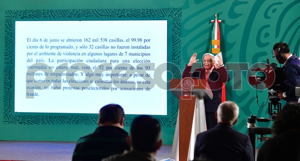05 de Julio de 2021.-Andrés Manuel López Obrador, Presidente de Mexico , en la conferencia mañanera , lo acompaña : Surit Berenice Romero Domínguez, subprocuradora de Servicios y encargada de despacho de la Procuraduría Federal del Consumidor (Profeco), en el Salón Tesorería de Palacio Nacional, Ciudad de México.Foto:Benjamin Flores/Proceso