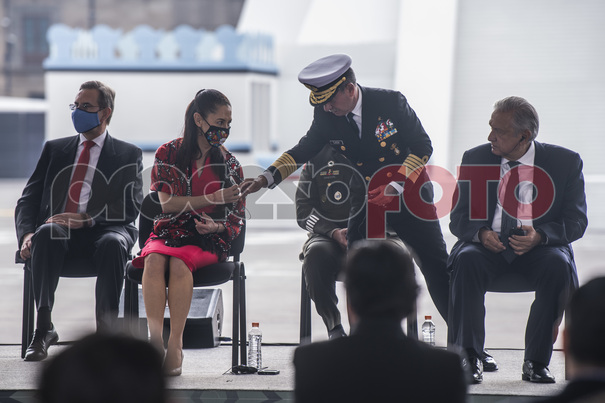 El Presidente de la República Andrés Manuel López Obrador encabezo la ceremonia por los 500 Años de Resistencia IndÃgena 1521 México-Tenochtitlan en el Zócao de la Ciudad de México, en la imagen lo acompañan la Jefa de Gobierno Claudia Sheinbaum, el secretario de Marina Rafael Ojeda Durá, y el Embajador Esteban Moctezuma.