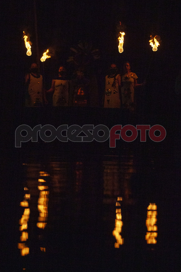 Esta tarde se llevó a cabo la función de presentación de la obra de teatro La Leyenda de la Llorona ´La Cihuacóatl realizada frente a la Laguna del Toro en los Canales de Xochimilco en el sur de la Ciudad de México con los asistentes en trajineras abordadas en el embarcadero Fernando Celada en el Barrio San Juan Tlalteuhchi de esa alcaldía durante todo el mes de noviembre en el marco de las celebraciones del Día de Muertos
