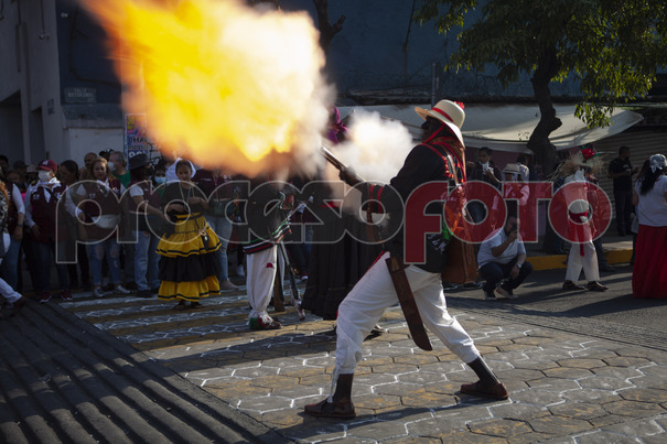 En medio de cañonazos, olor a polvora y música de banda vecinos del Peñón de los Baños, en las inmediaciones del Aeropuerto Internacional de la Ciudad de México, conmemoraron la Batalla de Puebla con su tradicional representación de franceses contra zacapoaxtlas