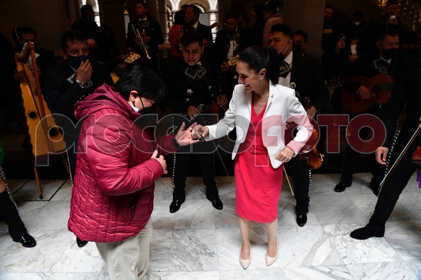 24 de Junio de 2022.-Trabajadores del gobierno de la Cdmx y comerciantes, festejan con mariachi , pastel y tamales los 60 años de la Jefa de Gobierno: Claudia Sheinbaum, en antiguo Palacio del Ayuntamiento, Ciudad de México.Foto:Benjamín Flores/Proceso