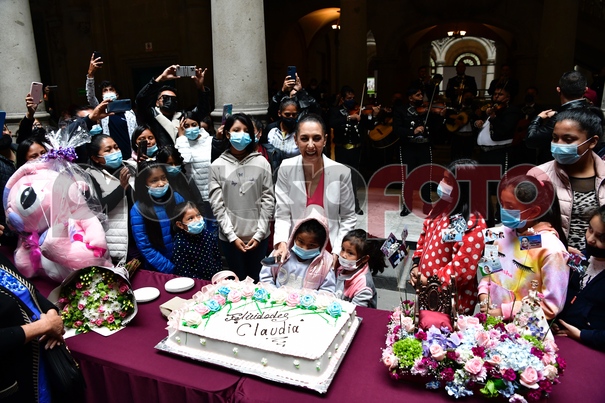 24 de Junio de 2022.-Trabajadores del gobierno de la Cdmx y comerciantes, festejan con mariachi , pastel y tamales los 60 años de la Jefa de Gobierno: Claudia Sheinbaum, en antiguo Palacio del Ayuntamiento, Ciudad de México.Foto:Benjamín Flores/Proceso