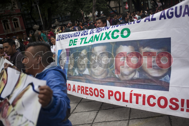 Familiares de defensores del agua de Tlanixco marchan junto a ejidatarios de Atenco en contra de la construcción del Nuevo Aeropuerto Internacional de México (NAIM).