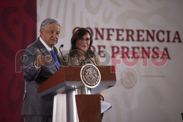 El presidente Andrés Manuel López Obrador y la titular de la Sener, Rocío Nahle, en conferencia de prensa donde anunciaron que Pemex y Sener construirán la refinería de Dos Bocas.