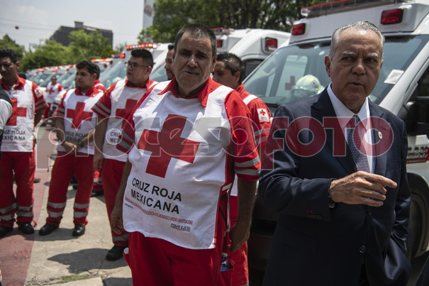 El presidente nacional de Cruz Roja, Carlos Freaner Figueroa acompañado de Antonio Domínguez Sagols, Director General de Fundación Azteca encabezaron la ceremonIa de entrega de nuevas ambulancias para la Cruz Roja Mexicana como parte de la renovación del parque vehicular 2022, durante la ceremonia estuvo presente el ex presidente de dicha institución Fernando Suinaga entre otros.