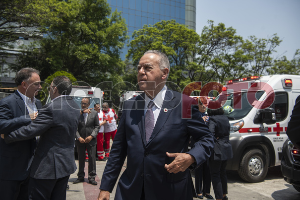 El presidente nacional de Cruz Roja, Carlos Freaner Figueroa acompañado de Antonio Domínguez Sagols, Director General de Fundación Azteca encabezaron la ceremonIa de entrega de nuevas ambulancias para la Cruz Roja Mexicana como parte de la renovación del parque vehicular 2022, durante la ceremonia estuvo presente el ex presidente de dicha institución Fernando Suinaga entre otros.