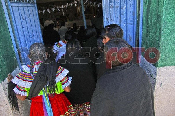 09 de Enero de 2024.-Mujeres con su tradicional y colorida vestimenta en la comunidad nahua Papaxtla de la montaña baja afuera de la capilla. Foto: José Luis de la Cruz/Procesofoto/Gro